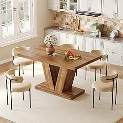 Modern Aesthetics: The 47-inch dining table, with its fresh brown finish beautifully complements the V-shaped pedestal, seamlessly blending modern elegance with a rustic twist into your kitchen or dining area Accommodates Four: Sized to comfortably seat 4, this versatile dining room table is your perfect partner for daily family meals or for hosting weekend brunches and gatherings with friends Robust and Reliable: Constructed from enduring wood, this kitchen table keeps long-lasting stability. The distinct V-shaped pedestal adds a rustic touch and ensures sturdy support to the whole structure Versatile Design: With its refined aesthetics, this table effortlessly adapts to your dining room, kitchen or living room. Use it as a chic dining table, or a fun gaming table in living areas Easy Clean-Up: The dinner table’s sleek surface is not only visually appealing but is also easy-to-clean. A simple wipe-down with a damp cloth maintains its pristine condition, ensuring its splendid looks last for years