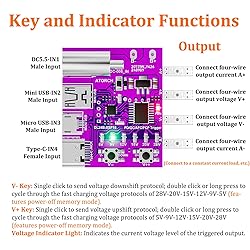【Supports Multiple Fast Charging Protocols】This device supports PD3.1 and is compatible with multiple protocols such as PD3.0, QC, AFC, and FCP voltage triggers. It supports PD3.1: 5V, 9V, 12V, 15V, 20V, 28V; PD protocol: 5V, 9V, 12V, 15V, 20V; QC protocol: 5V, 9V, 12V, 20V; AFC protocol: 5V, 9V; FCP protocol: 5V, 9V, 12V 【Digital Voltage and Current Meter】The 4-wire output fast charging protocol high voltage trigger board can induce fast charging voltages of 5V, 9V, 12V, 15V, 20V, and 28V by sending fast charging protocols to chargers or power banks with fast charging protocols. This enables various aging tests, quality assessments, and differentiation of voltage, current, and power 【Memory Function】It features a power-off memory function for voltage levels and modes, allowing it to display the current voltage and load current values accurately. The measurement mode can be saved to memory, enabling the device to automatically enter the same mode upon the next power-up, significantly reducing testing time and improving production testing efficiency 【Plug and Play】Connect Type-C-IN4 to a PD3.1-compatible charger or power bank using a dedicated data cable with E-marker. If the PD3.1 handshake is successful, the power (PWR) and voltage indicator lights will illuminate. Single-clicking the increase or decrease buttons outputs different voltage levels, while long-pressing or double-clicking will sequentially send different protocol levels to trigger corresponding voltage displays 【2-in-1 Current and Voltage Meter】It is not just a PD trigger but also features a digital voltage and current meter. You can use the V+ button to single-click for incrementing protocols, and double-clicking or long-pressing will sequentially send PD trigger protocols for 5V, 9V, 12V, 15V, 20V, and 28V. The voltage indicator light shows the current output voltage level being triggered