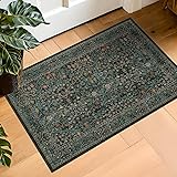 Dark Green Washable Entry Rug - Front Door Throw Rugs Indoor, Non-Slip Bathroom Small Rugs, Vintage Floral Thin Rug for Kitchen, Boho Entryway Décor (2x3 Dark Green)