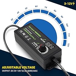 Input & Output -- Input: AC 100~240V, 50/60Hz ; Output: DC 3~12V Adjustable, Max 5A 60W ; It can supply with any voltage of indoor electronics between 3~12V, such as 3V 4V 5V 6V 7V 8V 9V 10V 11V 12V, etc and any amp less than 5A. Please choose correct voltage before plug it to your device. Wrong voltage may damage your device Plug Design -- Fit for both 5.5x2.5mm & 5.5x2.1mm plug. This cable terminates with a "standard" 5.5mm OD, 2.5mm ID DC plug, but it's also compatible with DC 5.5x2.1mm socket with the inner center spring contact. (NOTE: Power Supply Polarity: Center or Tip is positive (+), Sleeve is negative(-) Real-time LED Volt Display Function -- Easy to use with the switch knob. Also you can control and monitor the power supply output voltage and from virtually with the LED display. LCD display will show the output voltage, in case that wrong voltage regulation damage your device Built-in Power Supply Protection-- Certified by UL, it ensures safe use with over voltage, over current, and over temperature protection to keep all of your mobile devices safe from unexpected surges and spikes. Wide voltage range from 100V to 240V makes it suitable for travel Wide Range of Applications -- The 60W all-in-one multipurpose AC/DC adapter fit for many 3~12V small household electronics such as LED strips, under-cabinet light, TV Box, smart speaks, wireless routers, essential oil diffuser humidifier, USB fan, Wifi camera, USB Hub, hard disk box, DC motor, DC pump, digital photo frame, DVR NVR surveillance system etc.For indoor use only