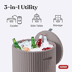 - Take it easy while your beverages chilled at the same time! The Keter Side Table Cooler is a stylish table option that cleverly conceals a 10.3 Gallon cooler beneath its comfortable and trendy design. Crafted from weather-resistant resin, it's perfect for both indoor and outdoor settings and is available in a range of vibrant colors. This table cooler’s sturdy lid has a weight capacity of up to 220 pounds! This innovative lid design lets this product serve as your side table one moment and transform into a chilled cooler the next.