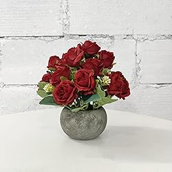 DECORATE YOUR SPACE WITH ARTIFICIAL FLOWERS: Our Artificial Flower Mini Pots feature small red roses and greenery, they are delicate and beautiful decorations to accent your space, the vibrant colours and vintage styling add a touch of elegance to any decor style. MADE WITH HEART: Our small red roses artificial flowers are made of silk and the green leaves are made of soft plastic, the brightly coloured flowers and natural foliage make these fake plants more realistic and natural. The flower pots are made of special paper pulp for a vintage realistic texture and look. Note: Please do not immerse the flower pot in water. NO CARE AND LONG LASTING BEAUTY: Our small red roses artificial flowers require no maintenance or care, they are perfect decorations for all year round, they will neither wilt nor fade, they can keep their beautiful image for a long time, when there is dust on the artificial plants, just wipe it with a damp cloth. SMALL AND DELICATE, DOESN'T TAKE UP MUCH SPACE: Our small red roses artificial potted plant unfolds to measure approximately 7 inches * 7 inches * 7 inches'; the branches and flowers of these plants are freely adjustable in their form, but be aware that the flowers and foliage may be crushed during shipping. After receiving the potted plants, please comb the leaves to the best condition. WIDE APPLICATION SCENARIO: Whether you are decorating your office, dining room, bedroom, hotel, living room, or preparing for a party or wedding, these small fake plant pots decorations are perfect, they can bring elegance to all occasions and make your space more artistic!