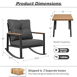 Durable Metal Frame: This patio bistro set features a superior metal frame with a powder-coated finish for enhanced durability and stability. The rocker can hold 350 lbs Humanized Rocking Design: The rocking chairs set equipped with the silicone strips and foot-pads at the bottom, helps prevent the patio chair from tipping over, ensuring safety during use 4.7” Thick Deep Seating Cushion:3-piece patio set is padded with upgraded fillings, providing good support and maintain shape after use. The fabric on the cushions is removable and washable Modern And Stylish Design:The faux wood armrest give the set a clean and minimalistic look and provide consistent temperature without too cold or hot. The wood grain table top is designed for easy maintenance and long-lasting outdoor use Easy To Assemble:This outdoor furniture set is easy to set up. Each part has its own number on installation manual, so you can track assembly progress easily, The set comes delivered in 2 boxes at different times so be patient to wait that please
