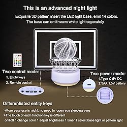 【Basketball Night Light】This is a 3D illusion sport decorative light that uses advanced carving technology to carve classic dunk patterns on acrylic sheets, bringing ultimate visual enjoyment to basketball enthusiasts and making it the best gift for fans. It can also be given as a Christmas gifts or birthday gifts to your friends and family. 【Entity key & Remote Control】 This Shooting decorative lamp use physical keys, which is more easy use than touch sensor switch. Without opening your sleeping eyes and just reach the different tactile textures on the key, you can judge the function, turn on / off the power, select the color, adjust the brightness, set the timer, and select the base lamp or the pattern lamp. It doesn't affect your sleep. 【 2 Lighting Modes 】 The Children's Table light has 14 colors that can be switched, and the brightness can also be adjusted as desired. The base is equipped with 2 sets of lights, which can control the color of the light board and base separately. The base can also be used separately as a night light. More choices to meet your different needs at different times. 【Power Supply Modes】The Upgraded mood light has built-in battery case, which is loaded with 3AA battery and can supply power for 24-72h. Charging circuit and devices was designed on the mainboard. Recommend insert 3 rechargeable AA batteries. External 5V DC power could supply the lamp lighting up and charge the battery at the same time, it can power on the light without insert battery. 【Timing Function】 The new basketball Lamp adds a timing function, which can realize the timing of 1H, 3H and 6h to meet the needs of people with timing needs.