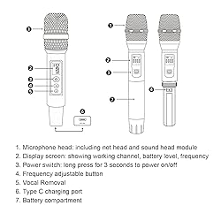 [Wide Device Compatibility] Compatible with smartphones, computers, tablets, tvs, amplifiers, and sound cards, providing optimal performance when used with amplifiers for small speakers. [Comfortable Design for Home Ktv] Comfortable grip and exquisite design make this microphone ideal for home ktv singing, adding more fun to family gatherings and entertainment. [Stable and Reliably Material] Made from aluminum alloy and plastic, this microphone ensures long-lasting use without causing fatigue, guaranteeing a comfortable user experience for all occasions. [Dual Microphone Support] Handheld cordless mic allows for two microphones to be used simultaneously, good for duets or group singing, enhancing interactivity and fun. [Dsp Technology for Crystal Clear Sound] cordless microphone with dsp technology effectively eliminates feedback noise and ensures professional reverberation for clear sound and voice effects.