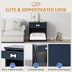 【Comfortable Pet Resting Area】This pet house furniture provides your pet with a cozy sanctuary. The semi-open bottom space and plush cushion (not included) offer a relaxing spot for small dogs or cats. 【Elegant Cottage Charm】The high-end curved tabletop edges, X-shaped side accents, and bone-shaped drawer handles complement the cottage-style decor, adding a touch of vintage charm. 【Two-in-One Pet Furniture】This wooden dog crate furniture doubles as a sofa side table and nightstand. It features a spacious width of 31.5", a semi-open space, and built-in warm lighting to create a cozy atmosphere. 【Durable Materials】This cat side table is made of P2 grade MDF board to prevent deformation and minimize maintenance. The eco-friendly materials ensure the safety of children, the elderly, and pets. 【Spacious Tabletop and Drawer】This multifunctional litter box enclosure has a tabletop measuring 27.5" x 15.7", perfect for displaying photo frames, potted plants, vases, and more. It also includes a drawer with ball-bearing slides, providing a private space for your pet’s favorite snacks, toys, or daily essentials, keeping your room neat and tidy.