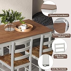 - Description:Create cozy dining moments with this 5-piece kitchen table and chair set. The spacious 45" x 28" tabletop offers plenty of room for dining and decorating, while the water-resistant acacia veneer makes for easy cleaning. Made of solid rubber wood, this set is sturdy and stable, with the table supporting up to 200 lbs and each chair up to 331 lbs. The space-saving design allows the chairs to tuck neatly under the table, making it ideal for small dining areas. Its charming wood veneer with a brushed finish provides a versatile vintage look that fits a variety of themes in kitchens, dining rooms, restaurants or tea rooms.Features:Perfect for enjoyable meals with loved ones in the comfort of your homeSpacious 45" x 28" surface for meals and decoration, easy to clean and maintainMade from stable rubber wood, can hold up to 200 lbs for the table and 331 lbs for each chairChairs can be tucked under the table for compact storage in small spacesVersatile wood veneer with a brushed finish to complement any interior designSimple instructions and hardware included for quick setupSuitable for everyday dining, entertaining guests, and casual coffee breaksAffordable yet quality dining set that adds style and functionality to your homeSpecifications:Color: Natural/Grey/BrownMaterial: Rubber Wood, Acacia Wood Veneer, MDF, PlywoodSize of the Dining Table: 45" x28" x30" (L x W x H)Size of the Dining Chair:16" x18" x34" (L x W x H)Ground Clearance of the Seat: 18"Weight Capacity of the Table: 200 IbsWeight Capacity of Each Chair: 331 lbsNet Weight: 38.5 IbsPackage Includes:1 x Dining Table4 x Chair1 x Instruction