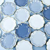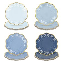 - Approx. 7" diameter. Each pack contains 24 paper plates in 4 special shades of dusty blue. perfect size for party. The scalloped edges of our dusty blue paper plates add an elegant touch to your tableware, making them perfect for any occasion. Made from thick, reliable paper with a protective film, ensuring they are resistant to water and oil. Serve cupcakes, candies, and snacks with confidence. Specifications: Materials: paper Size: 7 inch s Color: dusty blue and gold Package includes: 24 x paper plates Notes: Manual measurement, these may vary in sizes slightly. The color may exist a slight difference due to different screen displays.