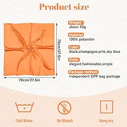 【Four color choices】You will receive satin square scarf in four colors: black,champagne,pink,and sky blue,size of the head scarf 27.5'' x 27.5''.The scarf color is bright and vivid,and the quantity is enough to meet your personal needs and show your personal charm. 【Soft and light】Silk head scarf is made of 100% high-quality polyester,It is soft and comfortable to touch,light and breathable,silky and shiny,low-key luxury,scarf suitable for all kinds of hairstyles and outfits. 【Multifunctional】As a fashionable matching item,square headband can be used for head scarf,headband,hair scarf,scarf,neck scarf,clothing accessories,hat accessories,bag accessories,etc.It embellishes your overall shape and sets off your elegant temperament. 【Easy to clean】Square scarf are breathable and easy to clean with replace. Wash gently by hand at temperatures below 30°C and hang or lay flat to dry. 【Wide Application】Satin head scarf is suitable for a variety of occasions,not only can be used in work and life,but also can be matched with embellishments for important events such as dances,birthday parties,dinners,weddings,travel,festivals,etc.
