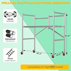 Strong Scaffolding Platform: Made of thickened galvanized pipe then fully welded, the sturdy frame & planks are strong enough to support up to 500LBs, gives you more confidence for interior home renovation projects. Useful Scaffolding Equipment: Instead of climbing up and down the ladder as much to get equipment, You could save more time and energy with work platform to place equipment. Make it convenient to do any home maintenance. Easy to Use Scaffold Set: With integrated design, the scaffold is easy to unfold when for working and fold up into a compact unit to store. It has 3 tiers, and you could choose where to place the pedals as per your need. Rolling Scaffolding Platform: The scaffold set comes with four locking wheels, you could simply roll on to the next area with the handy well built casters. In addition, you could choose to use the wheels or not at will. Widely Used Scaffold Platform: This scaffolding can be used both indoor and exterior. Suitable for building construction, interior painting, ceiling repair, changing light bulbs all these indoor/exterior remodel works.