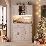 AMPLE STORAGE SPACE: This kitchen pantry storage cabinet has generous storage space, it contains 5 doors, 6 upper cabinets with adjustable shelves, 3 door shelves, a drawer, the microwave shelf with 6 hooks, a built-in charging station, and LED lights. This pantry cabinet is a perfect solution to the storage challenges of kitchen clutter. LED LIGHT & POWER OUTLET: The kitchen pantry storage cabinet is designed with brightness adjustable LED light. It has a variety of colors and flashing modes for the desired cozy ambiance. In addition, the pantry cabinet equipped with 2 AC outlets, 1 USB port, and 1 type C port, keeps your devices charged with convenience. MULTIFUNCTION PANTRY CABINET: This tall pantry storage cabinet boasts three door shelves and an easy-gliding drawer for small items, ensuring a clean and tidy kitchen. With a wide countertop and six extra hooks included, this pantry cabinet can easily hold spoons, kitchen tongs, or coffee cups. The adjustable shelves allow you to adjust the height to meet your individual needs. STABILITY AND SECURITY: The quality material of the pantry cabinets for kitchen storage can make the pantry cabinet extra solid for daily use. Using the wall connection fixer included securing this kitchen pantry buffet cabinet at the back to the wall for security concerns. EASY TO ASSEMBLE & CLEAR INSTRUCTION: All parts and accessories are numbered, and each installation step has detailed instructions that are easy to understand and assemble. We will check before delivery.