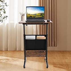- DescriptionIf you're looking for a desk that's both practical and convenient, then this adjustable-height standing desk is an ideal solution. The adjustable height and tilt angle of the desktop can accommodate people of different heights, allowing you to sit up more comfortably. It is designed with 360° swivel wheels with brakes for effortless movement and fixation, allowing you to move around your workspace or office with ease. A practical storage bag makes your working environment more neat and organized. It is a good helper for your work and study. ApplicationYou can place your computer, laptop, printer, books, etc., and use it as a portable presentation podium, mobile standing computer desk, laptop table, office desk, simple dining black table, study table, service table, writing desk, computer workstation or other items for your office, living room, lounge, study, or bedroom!SpecificationsMaterial: MDF, Carbon Steel, PlasticSurface Treatment: Press-laminate, Plastic SprayingColor: Brown, BlackStyle: ModernShape: RectangularAssembly Required: YesMount Type: Floor MountSpecial Feature: Adjustable Recommended Uses: Working, WritingAdjustable Tilt Angle: 180°Adjustable Height: 81-119cm/32-47inDesktop Size: 61*40.6cm/24*16inGround Leg Length: 40.6cm/16inGround Leg Spacing: 38cm/15inTotal Load-bearing Capacity: About 10kg/22lbsGross Weight: 5.7kg/12.57lbsNet Weight: 5kg/11lbsPackage Size: 72*45*10cm/28*18*4in Package Included1* Adjustable Height Standing Desk4* Wheels1* Storage Bag1* English Installation DiagramAll Accessories for Assembly Notes1.Please note that this product only includes a desk without other items.2.You should use a clean soft cloth to wipe the surface dust instead of using sharp objects to strike or hit the surface to avoid breakage. For carbon steel pipe surfaces with dust and dirt, you can use soap, weak detergent, or warm water to wash.3.Please note that the storage bag is not washable.4.Please allow the slight color difference caused by the shooting light and 1-3cm error due to manual measurement