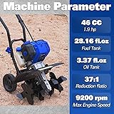 Powerful 46cc 4-Stroke Engine - Delivers 1,400W peak power at 9,200 RPM max, smoothly breaking through hard soil with consistent performance. Its no-mix fuel system (gas and oil separate) minimizes maintenance demands, while the precision-balanced engineering ensures low vibration, minimal noise, and low emissions for a fuel-efficient, eco-friendly operation. Efficient Cutting Capacity - With 6 steel forward-rotating blades and 4 angled tines, the tiller achieves a 16" working width and 8" tilling depth, efficiently breaking up soil and creating a finer, more uniform texture for superior seedbed preparation. Intuitive One-Hand Control - Designed for hassle-free operation, this cultivator combines a thumb throttle and power switch into a single-hand control panel. The ergonomic dual-grip handle ensures balanced maneuverability, complemented by a one-touch start/stop system that gets you started with minimal effort – perfect for plowing, soil turning, ditching, and weeding across farms, orchards, gardens, and sloped terrains. Easy Start and Storage - Equipped with an automatic reset choke lever and compression release system for quick and easy startup. The foldable handles ensure convenient storage, saving space in your storage area. Customer Support - We are committed to your satisfaction and stand behind the quality of our tiller. Please reach out to us via Amazon email if you have any questions. Our dedicated support team is always ready to assist, ensuring you have a smooth and enjoyable experience with our product.