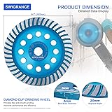 - Package Included: 1 x Turbo Row Diamond Grinding WheelFeatures: * Turbo Row Grinding Wheel: Our Concrete Diamond Grinding Cup Wheel is designed with 7" / 180mm diameter, 7/8" / 22mm arbor hole and 5mm diamond segment thickness. Segment width: 20mm; recommended RPM: 6600; Steel body thickness: 3mm. Allows quick material removal and leaves a smooth finish, with less vibration during operation to improve the experience and efficiency. * Dry/Wet Grinding | Wide Application: The diamond grinder cup wheel allows quick and smooth material removal, ideal for grinding material like concrete, granite, stone, marble, tile, cement, masonry. Suitable for grinder machine to remove thinset and excess materials on the surface quickly. * Premium Diamond Material: Our diamond grinding cup wheels are made of heat-treated steel body and high concentration of diamond, which provide long durability and aggressive material removal performance. Fast grinding & polishing effect on masonry, stone, and concrete. * Exhaust Hole Design: It features air holes designed to maintain and cool the cutting pattern, reducing wear and improving the work efficiency. * With Reducing Rings: 2Pcs steel rings (22mm to 16mm(5/8"), 22mm to 20mm), reducing the arbor diameter to achieve more compatibility with different grinders.