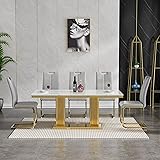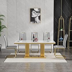 - Dining Table FeaturesRectangular dining table of modern design with fixed 0.71" marble printing MDF top and smooth edges. Its double stainless steel base with mirrored finish is one of the key elements to highlight in its design. A perfect table to bring the elegance and avant-garde style to your kitchen, living room, or dining room.ELEGANCE STYLE: Stainless steel base with mirrored finish is the combination of classical and modern. Match with marble printing MDF top to bring your home a whole new art style.AESTHETIC AND PRACTICAL: Versatile and functional, its rectangular marble printing MDF top offers the vintage and elegance feel that you are looking for in your dream home.HIGH QUALITY: All our dining tables are made with high quality materials, guaranteeing durable and functional furniture.DECORATION AND COMFORT: The combination of MDF and stainless steel makes this dining table a perfect element to bring you the art of visure. The tabletop is big enough for 6 people to dine at the same time. Dining Chairs FeaturesThe light luxury single chair is simple and suitable for multiple scenesErgonomic design, smooth lines close to the waist, relieve fatigue, disperse pressureFresh thick sponge covers the seat panel, Elegant curve for comfort and aestheticsBeautiful appearance and quality coexist to meet the visual demand for beautyThe seat surface is made of PU material and filled with high-density sponge, which is comfortable and softThe base is strong and durable,The adjustable foot is non-slip and silentEach accessory flexible Mosaic set easy combination more convenient operation Package Include:1 x Dining Table8 x Dining Chairs