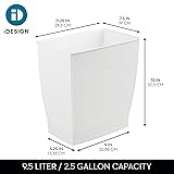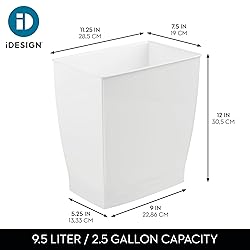NARROW TRASH CAN - The iDesign Mono Trash Can displays a rectangular, open-top design that makes for easy trash disposal, and its slim profile makes it ideal for narrow spaces, like inside cabinets or under the desk and sink; Set of 4 VERSATILE - Between its compact size and durable construction, this small plastic trash can complements any decor and handles everyday messes with ease, making this a chic and practical waste solution for daily use MODERN STYLE - The bright white finish brings an elevated look to this narrow trash bin, making it the perfect finishing touch to any kitchen, bathroom, bedroom, laundry room, office, dorm room, or RV QUALITY CONSTRUCTION - Made of BPA-free plastic that is shatter-resistant; EASY CARE - Clean with mild soap and water MADE TO FIT - Overall dimensions 11.25" x 7.5" x 12" high / 28,5 cm x 19 cm x 30.5 cm; 2.5 gallon/9.5 liter capacity; Tapered design fits into compact spaces while offering full capacity at the top; Inside bottom measures 9" x 5.25" / 22,86 cm x 13,33 cm