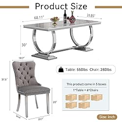 - The 7 Piece Dining Set features a sleek imitation marble tabletop sitting on a sturdy stainless steel frame and 6 matching dining chairs. With an ultra-modern appearance, the set situates itself at the heart of your dining space with unmatched aesthetics and thoughtfully-designed details. The luxury marble top provides supreme durability and creates a stunning light effect. Chairs are perfectly padded to give muscle-supporting comfort. All feet are capped to keep the floor from scratching. The 7 Piece Dining Set stands out with contemporary appeal. It is simple but stylish and captures the radiant warmth of a family dining space. Specifications Table: ✔ Dimensions: 68'' L x 34'' W x 30'' H ✔ Load-bearing: 550lbs ✔ Material: MDF with marble veneer & stainless steel ✔ Weight: 150 lbs Chairs: ✔ Dimensions: 19.7''L X 24.4"W X 37.5"H ✔ Load-bearing: 280lbs ✔ Material: Velvet & stainless steel ✔ Single Chair Weight: 16.3 lbs Package Includes 1 x Dining Table 6 x Dining Chairs 1 x Assembly Instruction 1 x Assembly Tool