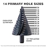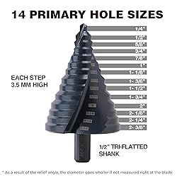 [Made of High Speed Steel] Premium material and surface treatment ensures the durability and sharpness. This unibit can drill holes on Iron, Aluminum, Copper, Plastic, Wood, or anything that has similar or lower hardness as these materials. [No Pilot Hole Required]: Self-starting & non-walking spilt point tip design helps you start drilling quickly. [Non-stop]: Our Polished Steps and Size Highlights let you able to see target hole size during drilling. No need to stop in the middle of the drilling and check. Save you time and hassle. [Multi Hole Sizes]: No need to buy a kit. This one step bit comes with 14 marked sizes so you can drill 14 different hole sizes, saving you time and efforts to change bits. Marked sizes including: 1/4", 1/2", 5/8", 3/4", 7/8", 1", 1-1/8", 1-3/8", 1-1/2", 1-3/4", 2", 2-1/8", 2-1/4", 2-3/8". [Know More About Us]: Jerax tools is a professional step bits manufacturer and all our step drill bits are all made of HSS. We also provide the high grade & top grade step bits for stainless steel & other thick material. Visit our store to know more tools!