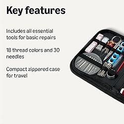 Mini sewing kit with all the essentials for basic sewing and repairs; suitable for novice and expert sewers alike Includes thread (18 colors), 30 needles, scissors, buttons, thimbles, measuring tape, threader, seam ripper, safety pins Zippered storage case with internal elastic bands for keeping all the pieces securely in place Portable, compact design works well for home or travel