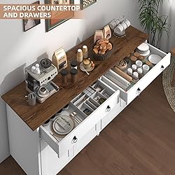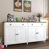 Ample storage space:The spacious 55'' tabletop can hold frequently used small appliances, coffee maker or toaster. The two large drawers can store some tableware and tissues for easy access on a daily basis. The shelves in the buffet cabinet with storage underneath are adjustable to maximize the storage space while keeping things in order Multifunctional sideboards: This sideboard buffet cabinet is multifunctional, you can either use it as a kitchen sideboard to store tableware, or put it in the dining room as a coffee bar cabinet, or put it in the living room to store sundries, no matter where you use it can make your living space well organized Classic modern style:The white buffet cabinet with black metal handles and walnut-colored tabletop make the whole cabinet present a modern and elegant style, clean lines and its simple style is suitable for a variety of spaces such as dining room, living room or bedroom Sturdy Construction: The sideboard buffet cabinet with storage is made of thicker MDF and quality hardware for impressive structural strength, stability. The tabletop can hold up to 300 pounds and has overall dimensions of 15.7 “D x 55 ‘W x 30.5 ’H Easy to assemble: Each board in the package is labeled with numbers, easy to find when assembling, making it easier for you to assemble this sideboard buffet cabinet with storage
