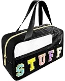 Chenille Letter Clear Makeup Bag Stuff Patch, Travel Toiletry Makeup Bag with Handle, Nylon Waterproof Makeup Bags clear cosmetic bag, preppy patch makeup bag for Women (STUFF-Black)