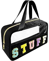 - Our clear STUFF makeup letter bag will stand out from all of the rest! 1. Travel in style with this STUFF letter patch makeup bag and make sure that all of your snacks and toiletries are organized in one place. 2. Each pouch made with high quality materials to ensure a long lasting beautiful design! 3.Travel toiletry storage with durable, splash-proof material keep your items safe and secure while you're on the go. (Note: the zipper is not waterproof) 4.Transparent design makes Clear Travel Makeup Letter Bag easier to see what items you have and where they are located, helping you save time when you are looking for something specific. 5.Double fine stitching at both sides of the zipper to protect the zipper and make this Nylon clear cosmetic bag more sturdy. 6.This clear travel makeup organizer suitable for all ages, men and women, as well as children, to meet the needs of their travel in the wash. Question: Is it normal for clear plastic cosmetic bags to harden in winter? Yes, it is normal for a clear plastic makeup bag to become stiff in cold weather. This is because the material's molecular chains slow down, making it less flexible. To help keep the bag soft and pliable, it is best to store it in a warm place and keep it away from direct sunlight. Secondly, you can try using hot water if the piece is small and thin or a hair drier on hot if a small section of a larger piece needs to be softened. Additionally, some people recommend adding a few drops of olive oil or coconut oil to the bag to help keep it soft and pliable.