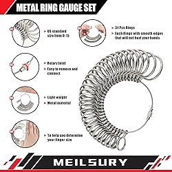 - MeilsurY 4 Piece Ring Sizer Measuring Tool,Ring Measurer and Ring Sizer Kit for Jewelry Making. Premium Ring Making Kit Including Ring Size Mandrel, Solid Metal Stick, Jewelry Mallet, Metal Ring Gauge Set 【Package Included】This ring-making kit package includes 1x ring size mandrel, 1x ring mandrel, 1x jewelry hammer, and 1x ring gauge. The ring sizer set helps quickly determine ring and finger sizes. 【Ring Mandrel】Ring mandrel for easy ring making. Perfect for creating wire wrap loops and constructing rings. Keeps the shape perfect and is easy to maneuver. Equipped with a heavy-duty ring mandrel and jewelry hammer, it can easily reshape rings. 【Ring size mandrel】The ring size mandrel is made of aluminum, marked with US size standards, and features smooth edges. It is finely crafted, lightweight, and durable. 【Jewelry hammer】The jewelry hammer has a mallet head with two sides, useful for flattening or shaping steel wire. It can adjust or repair rings and other jewelry without leaving marks or causing damage. The mallet head protects jewelry from scratches or harm. 【Ring Gauge】US sizes 0-15 are clearly marked, making them easy to use and ensuring accuracy. It comes with a flexible cable featuring a screw connection for easy opening. 【Easy to Use】 These essential jewelry making tools are designed for wire working and jewelry projects. They offer an easy solution for accurately measuring ring sizes. Suitable for both professionals and beginners, they are indispensable for artisans and newcomers alike.
