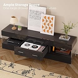 Modern TV stands for Living Room: Featuring a high-gloss finish combined with striking stone-patterned side panels, this TV cabinet adds a touch of modern sophistication to any living space, enhancing its overall aesthetic appeal. The modern TV stand is perfect for TVs up to 65 inches Ample Storage Space: Equipped with one drawer and two open compartments, this media cabinet offers plenty of storage options. Perfect for organizing your media accessories. You can store CDs, videotapes, books and magazines in the drawer. The open shelves not only provide practical storage space, but also allow you to display your collection beautifully TV Stand with LED Lights: The integrated LED strip offers 7 colors and 22 dynamic modes to brighten up your entertainment space. Depending on your mood or décor, use the included remote control to select different lighting colors to add a dynamic and modern look to your entertainment area Thoughtful Details: This 60 inch TV stand is designed with safety and functionality in mind. The bottom-mounted sliding guides make the drawers operate smoothly, and the stylish round handles make the drawers easy to pull and aesthetically pleasing at the same time. Bottom-mounted foot spikes prevent the TV stand from directly touching the floor, reducing friction, minimizing noise and protecting both the floor and the living room tv stand Sturdy and Durable: This media console is constructed of high-quality particleboard and MDF board for durability. 2 anti-tipping devices to enhance the stability of the TV stand. This tv stand with shelves can withstand up to 200 pounds Versatile and Easy Assembly: This TV stand for bedroom is also perfect for the living room, gaming room and office, providing versatile storage solutions for any space. Comes with a detailed instruction manual and all necessary tools, ensuring a hassle-free assembly process