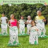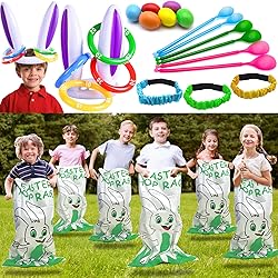 31 Pcs Value Easter Party Game Set: Included 6 bunny potato sack race bags, 6 plastic egg with spoon, 3 legged bands, 2 inflatable bunny ear with 8 ring toss; Enough quantity game set suitable for kids with family and friends to have fun at Easter party Bunny Potato Sack Bag: 6 bunny potato jumping bags measure 40 * 24 inch, suitable for kids and adults; Thicker Bunny bags are made of durable sacks, suitable for long-lasting use; Kids can hop into bunny potato sack race bags, enjoying endless fun Bunny Ears Ring Toss Games: Included 2 pack inflatable rabbit ears(16*9.84 inch) with 8 rings (7.5 inch) in red, blue, green and yellow; Each bunny ears hat is designed with 2 chin straps, helping to fix different head sizes Egg Spoon Relay Game: 6 pcs 12 inch spoons in pink blue and green, 6 pcs 2 inch plastic Easter eggs in red blue green orange yellow and purple; 12 inch longer spoons can increases difficulty, making kids get fun and improve their balance Perfect Easter Party Games: Outdoor family games set is suitable for Easter party activities, backyard games, Easter basket stuffers, spring summer toy pack, family outdoor games, kids birthday party games, school activities, camping and more