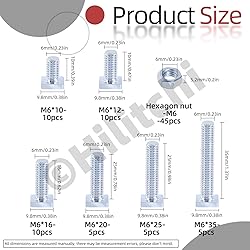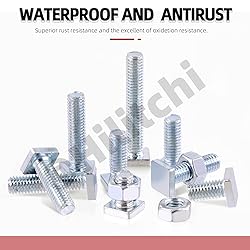 - Hilitchi 90PCS 6 Sizes Square Head Bolt Assortment Kit M6 x 10/12/16/20/25/35mm Blue White Zinc Square Machine Screws with Hex Nut Fully Thread Grade 4.8 Square Machine Screws Bolt for Machinery Specification: 💢Product type: Square Head Bolt 💢Material: Carbon Steel 💢Sizes: Refer to the Second Picture 💢Color: Blue 💢Quantity: 90Pcs WHY CHOOSE US? 💕High Quality: Made of high-quality carbon steel coated with blue and white zinc, anti-rust and anti-corrosion, has long service life. 💕Rich Sizes and Types: Comes with 6 different sizes, which are m6 x 10/12/16/20/25/35mm, meeting your daily fastening needs. 💕Wide Applications: Suitable for furniture installation, guardrail assembly, electrical connections, construction, railway maintenance, steel frame houses etc. 💕Package Included: 💕5Pcs----------M6 x 35 Square Head Bolt 💕5Pcs----------M6 x 25 Square Head Bolt 💕5Pcs----------M6 x 20 Square Head Bolt 💕10Pcs--------M6 x 16 Square Head Bolt 💕10Pcs--------M6 x 12 Square Head Bolt 💕10Pcs--------M6 x 10 Square Head Bolt 💕45Pcs--------Hexagon Nut 💕Totally 90Pcs
