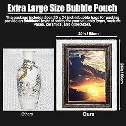 Extra Large Size for Enhanced Protection: the package includes 5 pack bubble bags for packing provide an additional layer of safety for your valuable items; Measuring at 20 x 24 inches/50 x 60 cm, these pouches have an extra large size that can accommodate even large fragile items like vases, ceramics, and collectibles Durable and Tough Protection: our packing bubble bags feature high-density bubbles with splendid toughness; The robust, shock-resistant bubbles can efficiently prevent breakage and scratches to your items, making them an ideal choice for protecting your fragile possessions User Friendly and Lightweight: these clear bubble bag pouches come with a user-friendly single sided opening design for easy insertion of items; They are lightweight, ensuring your item won't weigh more due to packaging and helps you save on costs Multiple Ways to Use: place your fragile or valuable items in our bubble pouch bag for added safety; Apart from securing individual items, the bags can be applied to fill gaps in cartons or other packaging materials, offering extra cushioning and shockproof protection Diverse Uses: these large bubble bags are versatile and suitable for a wide range of items; Ideal for packaging and storing fragile or valuable objects like jewelry, vases, ceramics, paintings, collectibles, or using as fillers to offer additional protection in boxes