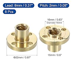 [Lead Screw Brass Nut] Material: Brass; Model: Tr8; Start: 4; Lead: 8mm/0.31"; Pitch: 2mm/0.08"; Screw Size: 22x15mm/0.87"x0.6"(OD*T); Center Distance: 16mm/0.63"; Mounting Hole Size: 3.5mm; Package Content: 8pcs x Lead Screw Brass Nuts [Material] Made of brass, the lead screw copper nut has a flat and smooth surface and is corrosion-resistant. It has high strength and hardness, is wear-resistant, durable, and can be used for a long time [Advantage] As a connecting component, the lead screw copper nut can firmly connect the ball or trapezoidal lead screw to ensure the stability and reliability of the mechanical system. It can significantly reduce the friction between the lead screw and the nut, thereby reducing the system's motion resistance and noise [Easy to Use] The lead screw copper nut is easy to use. Place the copper nut on the lead screw, make sure it is aligned with the thread groove of the lead screw, and slowly rotate the lead screw to gradually screw the copper nut along the lead screw until it reaches the desired installation position [Application] Trapezoidal nut linear screws provide strong support for the precise transmission and positioning of various equipment. They are suitable for 3D printers and can be widely used in various machine tools, casting machines, etc