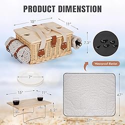【27Pcs Rich Tableware Sets】: Vintage Classic Hamper Set Includes 1 x handmade willow basket, 1 x foldable picnic table, 1 x Waterproof Mat, 1 x insulated wine bag, 2 x White porcelain handle stainless steel cutlery, 2 x glass wine glasses, 1 x all in one bottle opener, 4 x plastic plates, 2 x salt and pepper shakers. This wicker picnic basket has everything you need for a picnic with 2 friends 【Picnic Blanket & Wine Bag & Insulated Cooler】: Waterproof blanket made from breathable cotton/polyester, about 57" x 47" large size, it offers comfort while keeping you dry on damp grass; Substantial insulated wine bag both keeps your drinks chilled and protects the bottle from breaking at the same time; Specialized insulated compartment, this picnic basket keeps your food and drinks at the perfect temperature for up 【Handmade Durability】: Our picnic basket size is about 15" x 11" x 7.3", expertly handmade from natural premium willow, ensuring long-lasting strength and a classic, relaxing aesthetic. Enjoy a stylish, functional companion, Enough space to store picnic supplies that’s perfect for all your outdoor 【Foldable Picnic Table】: This compact table measures 15" x 11" x 6.2" and features sturdy natural Logs with durable metal legs. It's easy to carry and store, very portable and lightweight that making it perfect for any outdoor adventure. Picnic table with 2-inch wide cup slots, it’s designed to securely hold wine glasses, so you can enjoy your favorite drinks without worry 【Perfect Picnic Basket】:This picnic basket set is ideal for who like spring outings, picnics, camping and other outdoor activities, can also be used as gifts for major festivals such as Christmas, Halloween, Birthdays, Anniversaries, House Warming, Wedding Shower, and more. Delight your loved ones with a premium picnic experience they’ll cherish forever