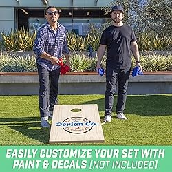 100% WOOD: These premium craftsmanship boards have a solid pine wood frame and a plywood surface (easily painted or customized) with a varnished pine wood veneer; Boards are also ready to use without additional work required FULL SIZE: Includes two 4 x 2 ft cornhole boards for authentic gameplay, 8 all-weather regulation bean bags, bean bag tote, and rules; Great for outdoor games in the backyard, at the park, or on the beach OUTDOOR FUN: Great for playing at home or any social gathering; Hours of fun cornhole games for adults & family at tailgates, holiday weekends, cookouts, campsites, and more PERSONALIZE YOUR SET: Customize the blank cornhole boards with your own decals and designs (not included) to make for the perfect cornhole set PORTABLE DESIGN: Boards attach together and feature built-in rope handles for easy transportation; No carry case needed; Store cornhole bags inside included bean bag tote