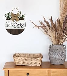 FemiaD Welcome to Our Home Front Door Sign Rustic Home Decor 12inch Round Wood Wreaths Porch Hanging Sign Farmhouse Wreath Wall Decor Front Door Wreaths for Home Wall Decor All Seasons Holiday