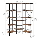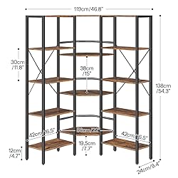 Spacious Storage: The L-shaped bookshelf features 14 open storage shelves, with its beveled edge design, offers expansive storage capabilities. It can hold books, CDs, and decor, adding a unique touch to your living space Efficient Corner Use: Measuring 46.8"L x 9.4"W x 54.3"H, this corner bookshelf is designed to fit neatly into room corners, offering a smart storage solution that helps keep your home tidy and organized Sturdy and Safe: Made of high-quality particleboard and a sturdy metal frame, the industrial bookcase is built to last. Each shelf holds up to 33 lbs. Adjustable feet and side X-crosses keep it stable, while the anti-tip kit adds extra safety Vintage Aesthetic: The 5-tier bookshelf combines a matte black metal frame with a rustic brown wood finish, blending elegance with a touch of modern style. It instantly adds a retro charm to your space and complements any home decor style Easy Assembly: All parts are clearly labeled. Just use the included tools and follow the illustrated manual step-by-step to assemble it quickly and enjoy the stylish and multifunctional bookshelf in no time