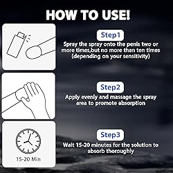 Safe Ingredients:Delayed spray,natural plant extracts,no side effects,is not greasy, and is easier to clean after use. Product Efficacy:Delay Sprayer for long last,extends time in bed,improves self-confidence and sensitivity,prolongs intimate pleasure between you and your partner,increase sexual satisfaction for both you & your partner,enjoy intercourse. Last Longer In Bed For Man:15-20 minutes before exercise,open the cap,gently spray in sensitive areas,allowing you to extend your staying power and enhance the duration of sexual pleasure. Easy to carry:A New generation of Delay Sprays,compact and lightweight bottle,keep it in your pocket for everyday use, traveling or business trips, so you can look your best at all times. Private Packages:Newly packaged delay spray,confidential and easy to carry,Shipped in plain packaging without displaying the contents of the package.