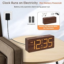 Easy To Use Wooden Digital Alarm Clock with Large Numbers: This modern electric alarm clock is designed with big bold 1.8 inches numbers that can be easily seen across the room, and simple to set, making it an ideal small digital clock for kids, teenagers, adults, seniors and the elderly. (Notice: The display only lit when plugged in) 6 Dimmable Brightness Level: DreamSky wooden bedside clock can be easily set with adjustable dimmer for different situation of using, dark enough for sleep and bright enough to watch in the day. 5 Adjustable Volume Level and Snooze Feature: Featuring an alarm volume of up to 105dB, this loud alarm clock is perfect for heavy sleepers and also accommodate light sleepers with an adjustable volume range from 70 to 105dB. And with the snooze function, you can earn a 9 minutes extra rest. Pug In Clock (Not Battery Powered): The DreamSky nightstand table clock is powered by the included adapter, which can provide a stable time display, making a handy wood clock for living room, bedroom, office, kids room etc. Alarm and Setting Backup: The battery backup feature of this wooden alarm clocks for bedrooms will keep the alarm work during the power outage, no worry for oversleeping. Meanwhile it can save the time setting, which can save the trouble of reset the clock. (Notice: Battery only operates alarm, not time display. The batteries are not included) One Click Changing for DST and 12/24 Hour: With an easy DST button on this simple alarm clock, you can quickly switch time for day light saving time. This large display digital clock also can easily change the time format between civilian time and military time using only one step, suit your habit simply. Decent Décor and Wonderful Gift: DreamSky digital desk clock is not only a clock, but also an space saving elegant decoration that fits your home and office while also works as a perfect gift for your family and friends as holiday or birthday gifts. Product Dimensions: Length 6.1 inch, Height 2.8 inch, Width 1.6 inch; Clock digits dimension: Height: 1.85 inch, Width: 0.95 inch