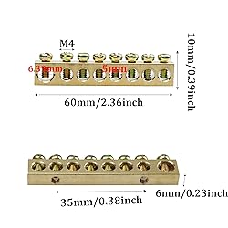 Package including: You will receive 6PCS 8 Positions Brass Neutral Copper Grounding Bars. Size: 60x6x10mm/2.36x0.23x0.39inch(L*W*H), mounting hole distance: 35mm/0.38inch. Heavy-duty construction: Made from high-quality brass materials, these 5-position electrical wire screw terminal ground bars provide excellent conductivity and durability. The strong construction ensures reliable performance in your distribution cabinet, withstanding the demands of professional electrical applications. Corrosion-resistant finish: To ensure long-lasting performance and reliability, these brass and copper grounding bars are treated with a corrosion-resistant finish. This protective coating helps prevent oxidation and maintains optimal conductivity over time, even in harsh environmental conditions. Easy installation: The grounding bars 8-hole electrical distribution cabinet wire screw terminal ground copper neutral bar is very easy to use,just Loose the screws,then insert the wire into the hole,last fasten the screws to hold tightly. Versatile compatibility: Designed to accommodate a wide range of wire gauges, these neutral grounding bars are suitable for various electrical projects. The 8-position design allows for multiple connections, making them ideal for use in distribution cabinets, electrical panels, and other wiring systems.