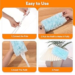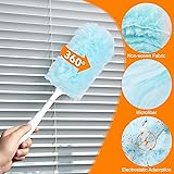【Generous large capacity】This set contains 50 pieces of blue disposable replacement dusters with 1 handle, easily solves multiple cleaning works, also compatible with Swiffer duster handle 【Dimension】The size of the disposable duster is 7.9 x 3.5 inches, the handle's size is 12.8 inches. Here is an overlap between the disposable duster head and the handle, and the two can reach 15 inches when joined together 【Electrostatic adsorption】This 360 degree dusters has electrostatic adsorption ability and soft fine fibers, easily reaching small spaces absorbing fine dust and hair, avoiding dust flying during the cleaning. It could help reduce allergens and improve indoor air quality 【Intimate design】The heavy duty dusters refills is designed for one-time use and can be replaced when the disposable replacement head is dusty. The handle is removable for easy storage.The unique design of the handle providing a stable grip when using 【Multipurpose】This duster refills is suitable for removing dust from home, office, car interiors, electronics, furniture, blinds, ceiling fans and even plants, the duster's fluffy microfiber bristles prevents scratches surface, it's lightweight design and flexibility make it ideal for cleaning hard-to-reach areas