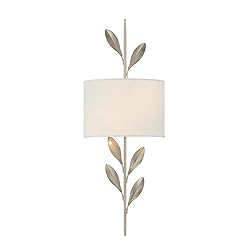 Broche collection features a versatile transitional design. Antique Silver metal finish is a mid-tone gray with lavender and blue undertones. This finish will add intensity to the overall look of an interior and perfect for farmhouse and rustic settings. A breezy, light-filled style that blends soft hues, natural materials, and nautical touches for a relaxed, seaside-inspired feel. Shipped with shades included. Inspired by Jewelry, the Broche features unique rhythmic pattern of the hand painted metal leaves. Materials: Steel + Fabric 2 light 60- watt, E12 Candelabra base. Dimensions: 8.5"W x 24"H x 4.5"D Authorized for use in dry interior locations. Meets United States UL Underwriters Laboratories Product Safety Standards.