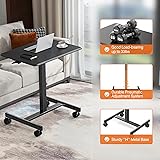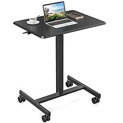 [Sturdy and Durable] MDF materials desktop is more durable and easy to clean. The metal H-shaped base is very sturdy. This standing desk can hold up to 33 lbs. [Lockable Mobile Desk] 4 silent wheels can easily help the mobile standing desk move smoothly to any corner of the home. Just lightly step on the 2 lockable wheels and it stays in place in no time. [Ergonomic Design] Sitting Mode: Fits most chairs. Standing Mode: Suitable for most people. [Sit Stand Desk] The height of this small standing desk can stay at any height between 28.5''-42.5'' with fast and smooth lifting. [Easy to Assemble] This standing desk with wheels can be easily installed and come with all the tools and accessories for quick assembly.