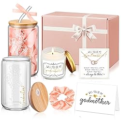 Godmother Gift Set: this pink godmother proposal gift set includes a 16oz glass cup, necklace, scented candle, greeting card, hair scrunchies, and gift box; Good for your grandmother, mother, friend, family expressing care and gratitude as an thoughtful way to present the godmother role to your closest friends or family Godmother Theme Design: the godmother gifts set features the sincere message "Will you be my godmother? "—a wonderful gift for Baptisms, Mother's Day, Christmas, Birthdays, and Thanksgiving; Combining practicality with emotional sentiment, this gift symbolizes appreciation and trust, inviting her to take on the special role of godmother and creating unforgettable moments and leaves a memorable impression Practical Glass Cup: this 16oz glass coffee cup is perfect for a variety of beverages, including iced coffee, tea, milk, juice, hot chocolate, soda, wine, and cocktails; The transparent glass mug is easy to clean and suitable for any occasion, complete with a lid and straw, with a bow on the straw, adding cute and delicate feelings Delicate Necklace Hair Tie: the Infinite double circle necklace symbolizes your sincere care with the elegant design, perfect for daily wear or special occasions, which makes you very attractive and elegant; The champagne-colored hair tie adds charms, for both hair and wrist, and ideal for everyday use Scented Candle Greeting Card: each scented candle in this godmother proposal gifts set is made of soy wax, providing a comforting aroma for a long-lasting fragrance experience; The beautifully printed greeting card allows you to leave a personal message of thanks and blessings