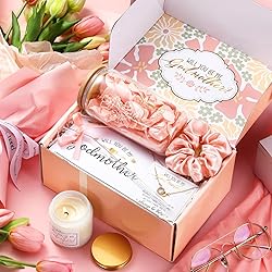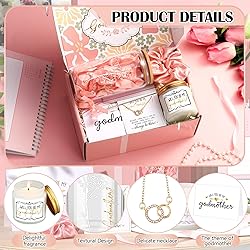 - Features: Gift-Ready Packaging: This godmother gift set comes beautifully packaged in a delicate gift box, so you don't need to worry about wrapping. It's ready to give, saving time and effort while ensuring a stylish and thoughtful presentation. Good Gift Set: This thoughtfully curated set includes a variety of practical and meaningful items, designed to meet different needs. From the elegant necklace to the attractive hair tie and comforting candle, each one offers both sentimental value and everyday convenience, making it a perfect gift for your godmother. Specifications: Material: glass Color: pink Size: 16 oz Package includes: 1 x Glass cup 1 x Necklace 1 x Scented candles 1 x Greeting card 1 x Hair Scrunchy 1 x Gift box Notes: Manual measurement, please allow slight errors on size. The color may exist a slight difference due to different screen displays.