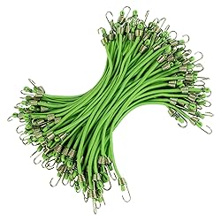 Quantity and Size: Each package comes with 50 small bungee cords. Each bungee cord is 10 inches long. small bungee cord can be stretched to 19 inches Strong Elasticity: These bungee straps with hooks are made of latex wire with strong tensile strength to hold your items firmly in place and return to their original shape without losing elasticity Adjustable Length: The mini bungee cords comes with zinc hooks, you can adjust the length according to the size of your items. Extend it by docking the two hooks together or knotting them. Shorten the length by knotting the rope and blocking the hooks at the knot Wide Uses: These small bungee cords with hooks have a wide range of applications for tent cloths, rain tarp fastening, small items, cable tie downs, tying down camping gear, organizing the garage, and items that require the use of short bungee cords Note: These rubber bungee cords are designed for lightweight items, not for heavy and oversized items. The hooks are designed to easily hang onto anchor points and will not bend under load for ease of use