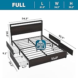 - Specifications: Name: Full Size Bed Frame with LED 4 Drawers Charging Station Color: Black Material: Metal, Wood Product Size: 81.7"L x 54.3"W x 39"H Product Weight: 88.7lbs Max Load Capacity: 800 lbs Features: 4Drawers, RGB LED Light, 2 Standard Plug Outlets & 1 USB Ports 1Type-C, Storage Headboard, Solid and Stable