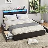 Kiivakii Full Size Bed Frame with Headboard, LED Platform Bed with 4 Storage Drawers, Built in Charging Station, Noise-Free, Metal Support Base, No Box Spring Needed, Black