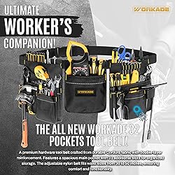 - The WORKADE Heavy Duty 32-Pockets Tool Belt is designed for durability, comfort, and efficiency. Crafted from double-layered Cordura heavy-duty fabric, this belt stands up to the toughest jobs, making it a reliable choice for construction workers, electricians, carpenters, and DIY enthusiasts. The reinforced stitching on pressure points ensures long-lasting performance, even under heavy loads.The 1.5” wide nylon ribbon band provides a secure fit for waist sizes up to 52 inches and features a quick-release durable plastic buckle for easy adjustments and removal. Built with high-grade polyester thread stitching, this tool belt offers exceptional strength, ensuring your tools stay secure and accessible throughout the day.With 32 spacious double-layered pockets and multiple loops, the WORKADE tool belt allows you to keep all your essential tools organized. Store your hammers, screwdrivers, pliers, wrenches, and measuring tape with ease. The thoughtfully designed layout makes this belt versatile for any task, whether you're on a job site or working on home projects.Features and Specifications:Material: Double-layered Cordura heavy-duty fabricWaist Size: Adjustable up to 52 inchesBelt Width: 1.5” wide nylon ribbon bandBuckle: Quick-release durable plastic buckleStitching: High-grade polyester thread with reinforced pressure pointsPockets: 8 double-layered pockets and multiple tool loopsBest for: Construction workers, electricians, carpenters, plumbers, DIY enthusiastsStay organized, efficient, and ready for any project with the WORKADE Heavy Duty Tool Belt – designed to handle the demands of professional and home use.