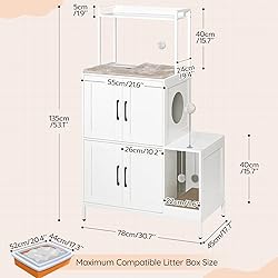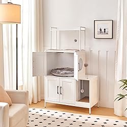 Dual Cat Paradise: This cat litter box enclosure adopts a dual-space design, ideal for pet-loving households. Two cats can indulge in their private moments, unbothered and harmonious, whether it's for toilet breaks or naps, enhancing their comfort Versatile Furniture: This vertically designed cat litter box house combines storage, resting and entertainment with space maximization. It blends practicality with aesthetics, making it a haven for feline life and an invaluable asset for pet owners Interactive Fun with Toys: With 2 hanging balls and a toy ball, this wooden litter box enclosure caters to cats' hunting instincts. It encourages exercise and boosts vitality, allowing your feline friend to unleash its energy and savor joyful moments Seamless Home Integration: Boasting a simple yet cozy appearance, this cat furniture fits well into any home decor. It stands as both a private area for your cat and a stylish accent, reflecting your meticulous care and unique taste for pet living Easy Cleaning: This hidden litter box enclosure has a fenced top for pet treats, toys, etc. and a corrugated paper litter filter at the entry tunnel for cat's scratching and litter spilling prevention. Its elevated bottom simplifies daily cleaning