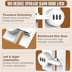 Solid Material: This 180 degree combination flip door lock is made of quality solid zinc alloy, with multiple layers of coating to ensure rust and wear resistance for durability 3- Digit Combination Security Lock: The sliding barn door lock offers up to 1,000 combinations of passwords that are easy to set and reset, allowing you to experience the convenience of keyless entry and enhanced security for barn doors, cabinets, and more Flexible Left/Right Installation: This combination cabinet lock latch is designed for installation on sliding barn doors or cabinets with a 180° opening, which can be installed in left or right hand direction according to your personal usage habits Easy Installation with Screws or Adhesive: This Keyless barn door latch can be installed in minutes by using screws or strong adhesive. Adhesive mounting eliminates the need to drill holes, making it suitable for doors that you wish to avoid causing damage Wide Application: This 180 degree door lock has a stylish and minimalist design, suitable for barn doors, cabinets, closets, shed doors and so on, it is an effective solution for securing your space Product Package: Each set of lock is equipped with screws, expansion tubes, glues, auxiliary stickers, instruction manual, hexagonal wrench, pin tool